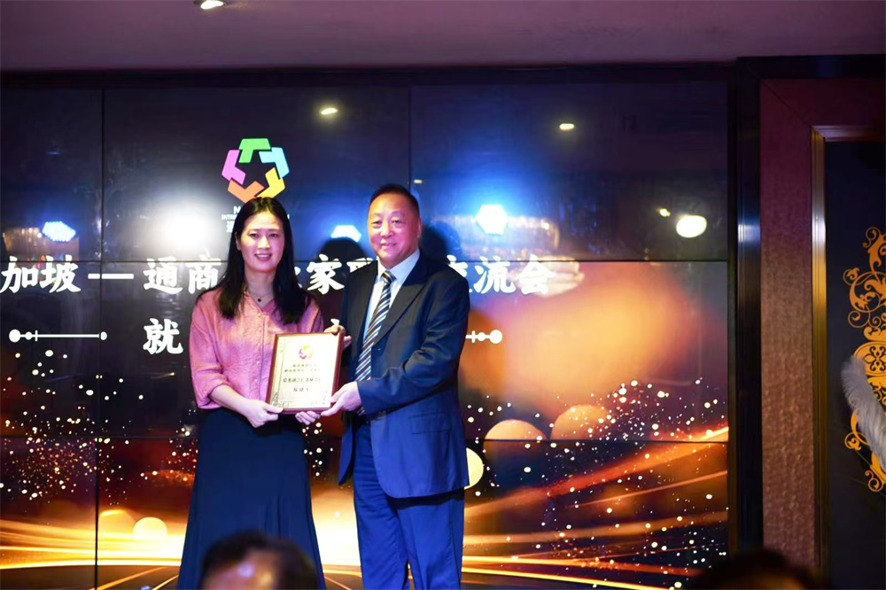 顾红菊为南通通商总会新加坡商会(同乡会)常务副会长兼秘书长郑建军授牌