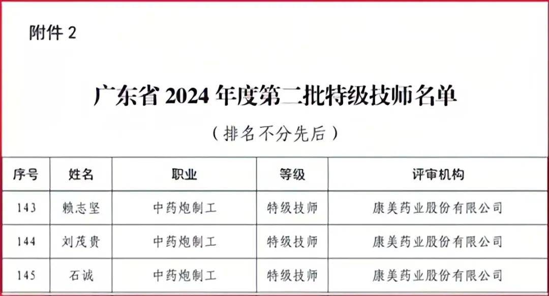 12月1日,广东省人力资源和社会保障厅发布《关于公布广东省2024年第二批首席技师、特级技师名单的通知》,康美药业董事长赖志坚、技术顾问刘茂贵、质量管理部副总监石诚凭借高超的中药炮制技能及在中药炮制专业技能领域做出的积极贡献,获评“广东省2024年中药炮制工特级技师”荣誉称号,2024年全省中药炮制工特级技师3份殊荣均花落康美药业!