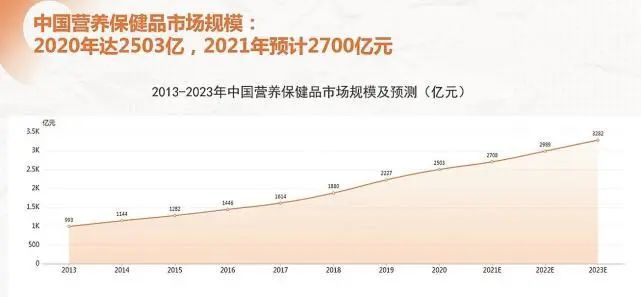 一块钱预防能省下十块钱的治疗!医学科普经年累月强调“预防>治疗”,大众的防病、保健、养生意识也逐年增强。报告显示,中国营养保健品市场规模2020年达2503亿,2021年预计2700亿元(见图3)。