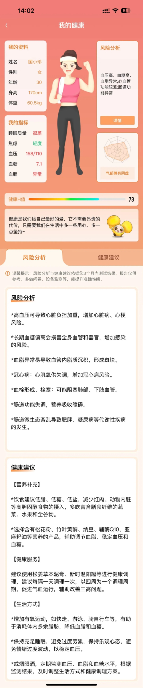 这里有我的资料、我的指标、我的体质、风险分析、健康H值、健康建议等板块,带您详细了解自身健康风险及改善建议,助您获得更好的健康生活。