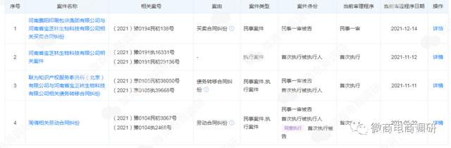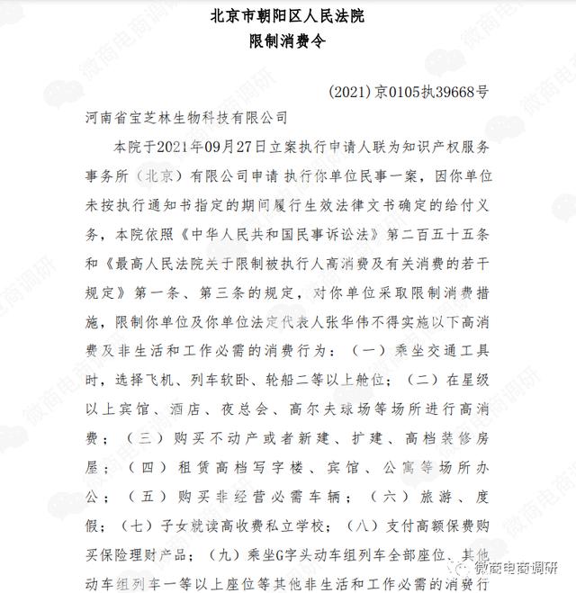 2021年5月,河南省宝芝林生物科技有限公司因无法联系而被郑州市市场监督管理局自贸区服务中心列入了经营异常名录,一个月后被移出。此外,河南宝芝林生物公司在2021年还牵扯到了三个民事纠纷,分别是买卖合同纠纷、债务转移合同纠纷和劳动合同纠纷,并且这家公司的法定代表人张华伟、杨友林分别于2021年9月27日和2021年11月12日被法院列为了失信被执行人,被限制了高消费,具体内容见下文截图。