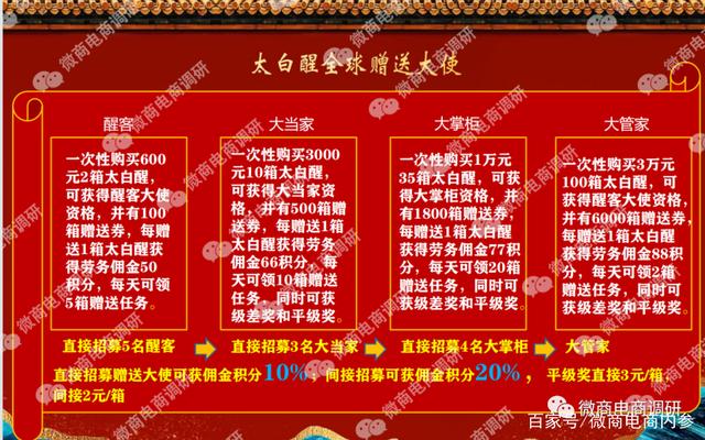 一次性购买3000元10箱太白醒,可获得大当家资格,并有500箱赠送券,每赠送1箱太白醒获得劳务佣金66积分,每天可领10箱赠送任务,同时可获级差奖和平级奖。