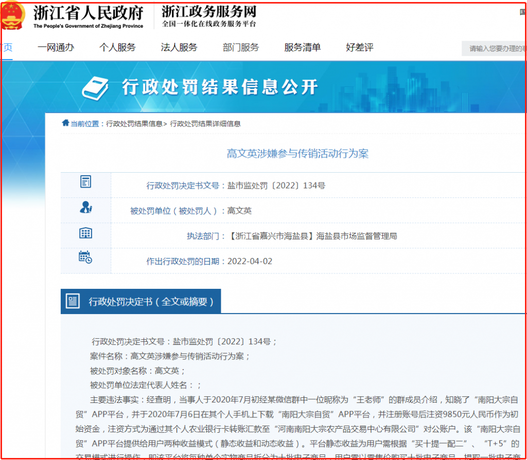 近日,本网通过浙江政务服务网了解到,浙江省嘉兴市海盐县两人因参与“南阳大宗自贸”APP传销案,被分别处罚1000元的行政罚款!