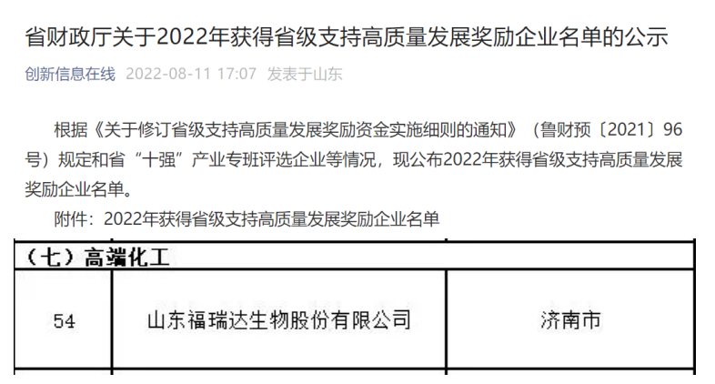 近日,根据《关于修订省级支持高质量发展奖励资金实施细则的通知》(鲁财预〔2021〕96号)规定和省“十强”产业专班评选企业等情况,山东省2022年度高质量发展奖励企业名单公布,山东福瑞达生物股份有限公司(简称福瑞达生物股份)荣登高端化工奖励企业榜单,获得行业权威认可及政策性激励。