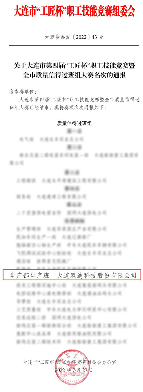 7月27日,双迪公司供应链中心保化生产部获得大连市第四届“工匠杯”职工技能竞赛暨全市质量信得过班组大赛优秀班组荣誉称号。作为大连市质量管理协会颁发的“2022年质量信得过班组”,这是保化生产部继在大连市第四届“工匠杯”职工技能竞赛暨全市电工技能大赛上取得优异成绩后,再战大连市第四届“工匠杯”职工技能竞赛,并惊喜再摘殊荣。