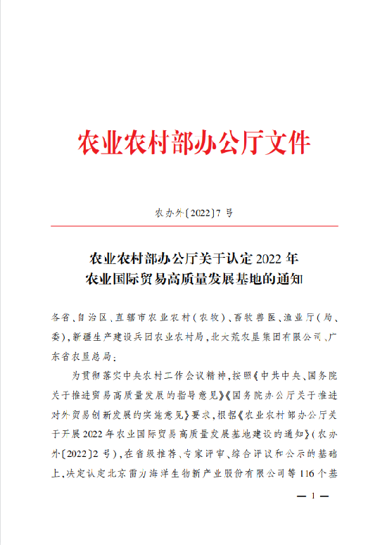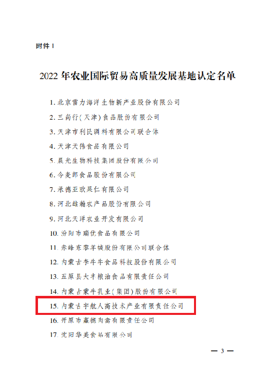 2022年,农业农村部正式发布了《关于认定2022年农业国际贸易高质量发展基地的通知》,宇航人作为沙棘行业的领军企业,被国家农业农村部认定为2022年度农业国际贸易高质量发展基地!