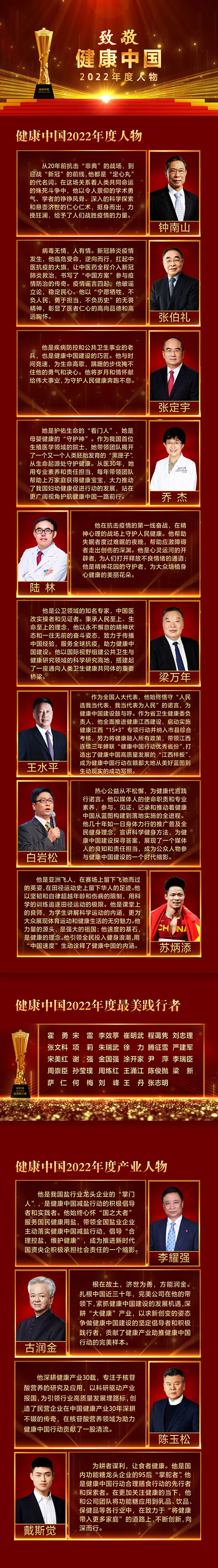 据了解,举办致敬健康中国2022年度人物盛典,旨在深入贯彻落实《“健康中国2030”规划纲要》《健康中国行动(2019—2030年)》等文件精神,大力宣传健康中国领域先进人物和先进典型,深入培育和践行社会主义核心价值观,营造学习宣传贯彻党的二十大精神的浓厚氛围,期冀以榜样的力量,把健康中国行动推向深入,在新时代奋力谱写健康中国建设新篇章!