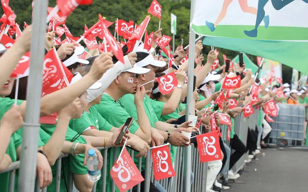 在20周年历程展赛道签名墙区域,大家纷纷插上20周年定制旗签到打卡,这面签到墙像一条时光隧道,带着我们回顾绿之韵20年,让我们再次重温那些努力奋斗、收获成绩的点滴。此外,集团20周年全新IP形象公仔“韵小宝”亮相。3.8米高的大型“韵小宝”,因其可爱的模样,迅速俘获了大批粉丝,跑友们纷纷驻足、拍照打卡。