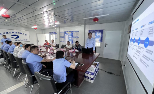 施工现场参观结束后,立刻开展了座谈交流。王伟介绍了公司整体概况,并从核心原料优势及供应链的完整性等多方面介绍了产业园区。朱容海一行对玻尿酸产业的前瞻性给予了充分肯定,并表示福瑞达做为玻尿酸的缔造者和领跑者,率先将玻尿酸应用于护肤品,开创国内玻尿酸护肤的先河,还打造了完整强大的供应链体系,为透明工厂、绿色工厂、数字工厂的落成使用提供了强有力的支撑。