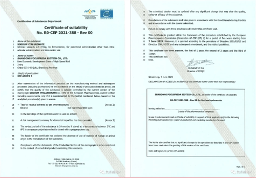 获得CEP证书意味着焦点福瑞达的玻璃酸钠取得了欧盟药品和医疗器械用原料的市场准入资格,是公司继2022年07月取得美国DMF登记号、2023年05月获得国内药用辅料I状态登记号后,首次获得的欧盟原料药批准文号,是公司原料板块向原料药及药用辅料等高端产业链转型升级中的又一里程碑,更是公司高质量发展的起点,对焦点福瑞达有重大和深远影响。