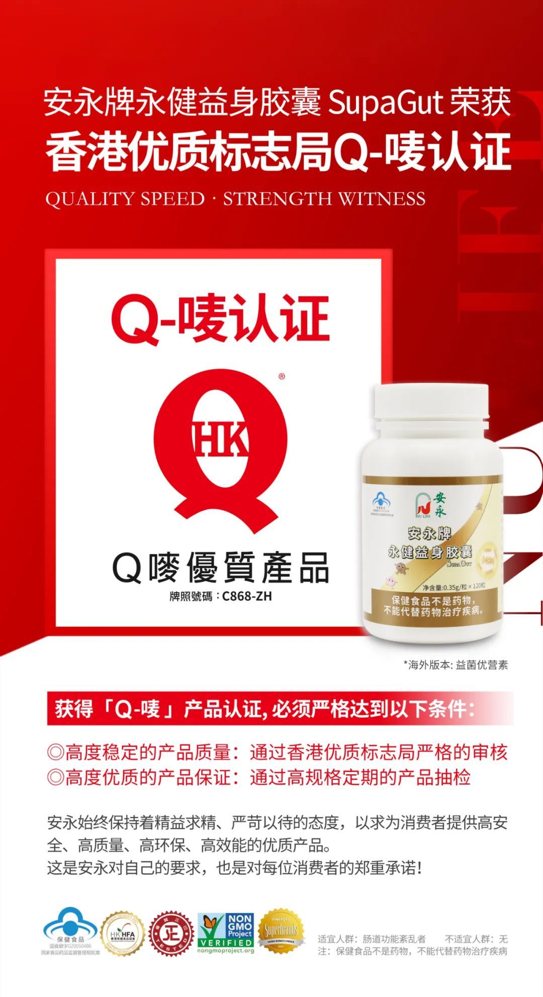 自1991年成立以来,安永NU LIFE一直致力于推广健康与财富。历经32年的发展,帮助万千企业家重拾健康并实现梦想。在这个值得庆祝的时刻,安永NU LIFE特别引以为傲的产品——安永牌永健益身胶囊(海外版:益菌优营素SupaGut),连续两年荣获「Q唛优质产品」认证(牌照号码:C868-ZH)。这是对其产品质量和有效性的最高认可。