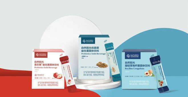 自然阳光多年以来始终坚持通过改善肠道健康来守护消费者代谢健康,目前已经推出了包含膳食纤维、益生菌、益生元、合生元、后生元、全面植物营养素在内的六大肠道营养产品矩阵。自然阳光的益生菌产品同样坚持在肠道健康这一益生菌细分市场。凝结芽孢杆菌固体饮料将益生菌活菌以芽孢形式进入人体,使益生菌能够在肠道内更好地发挥其生物活性。喜乐聚益生菌固体饮料采用了三种益生菌+三种益生元的科学配比,添加了两种美国杜邦专利菌种,同时添加天然草莓果粉以增加风味和口感。优萌君益生菌固体饮料除了帮助调节肠道菌群平衡之外,还能够调节消费者的胃部健康。
