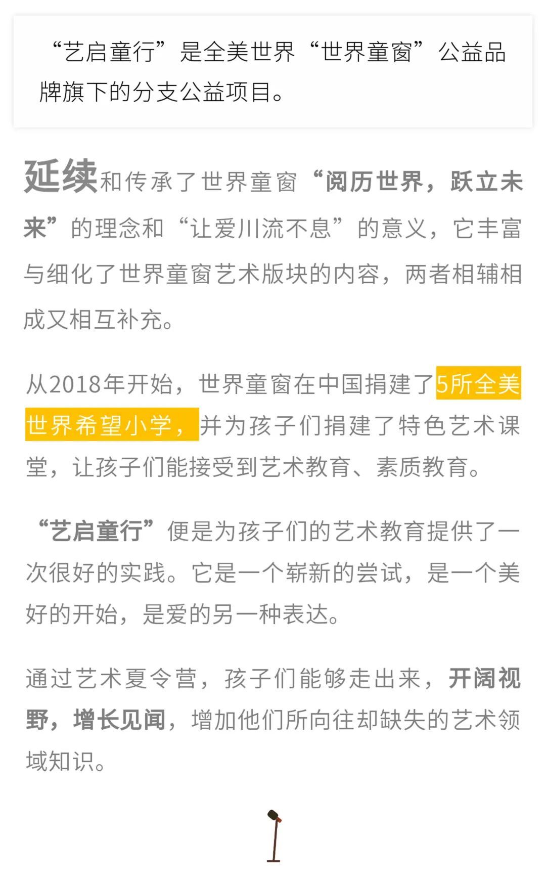 传承世界童窗公益初心,放飞远山的梦想和希望。全美世界精心企划“艺启童行”公益艺术夏令营,为爱而生,打开艺术之窗,阅立精彩世界,爱与艺术的炽热碰撞,让大山里的孩子开启崭新的世界。