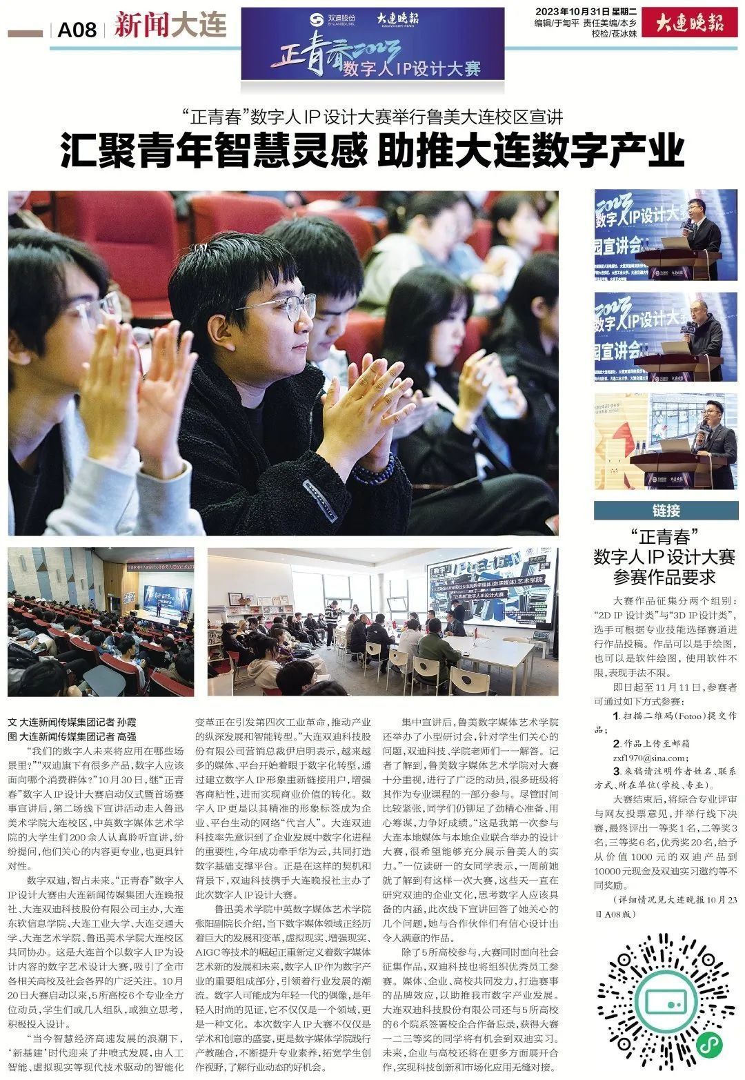 10月30日下午,“正青春”数字人IP设计大赛举行鲁迅美术学院大连校区宣讲。这是继10月20日在大连东软信息学院举办赛事启动会及首场说明会后,再次走进“五大赛事联校”校园。