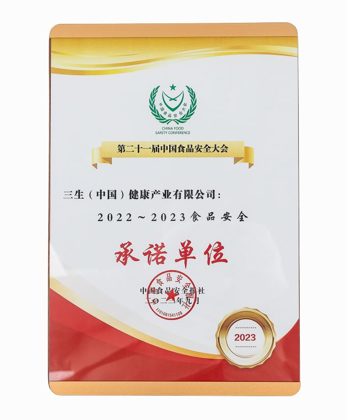 此次大会,三生(中国)凭借在食品安全领域的突出表现荣获2项食品安全荣誉奖项:2022—2023食品安全管理案例和2022—2023食品安全承诺单位。这些奖项的获得是对三生长期以来在食品安全领域取得成绩的肯定与鼓励。