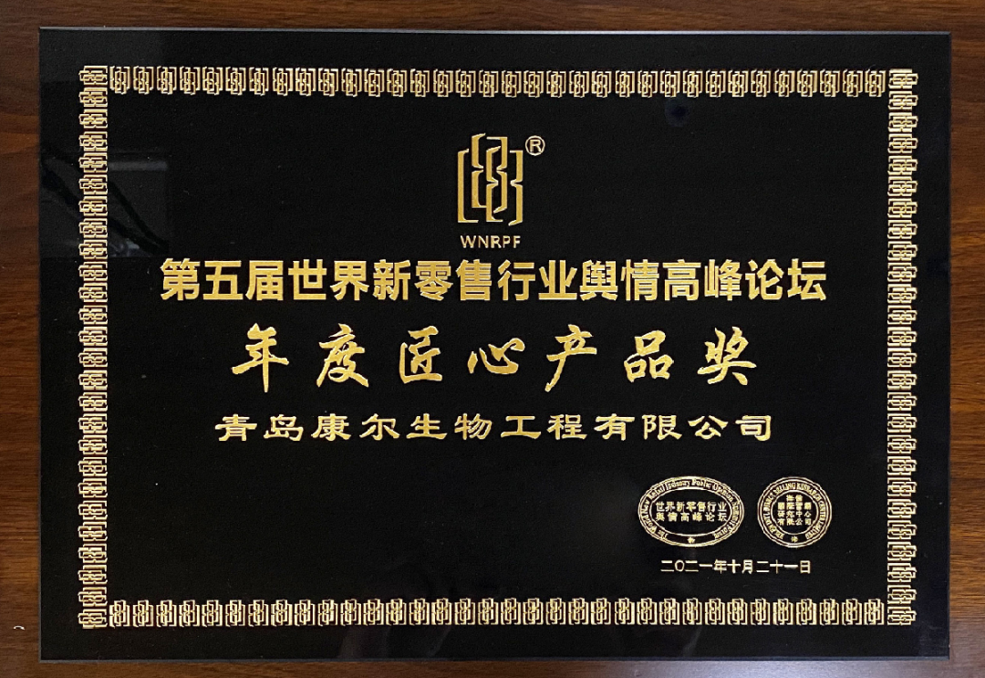 青岛康尔生物工程有限公司凭借极具匠心的海洋科技产品和高度的社会诚信度,得到社会各界的广泛认可与喜爱,荣膺第五届世界新零售行业舆情高峰论坛“年度匠心产品”奖。