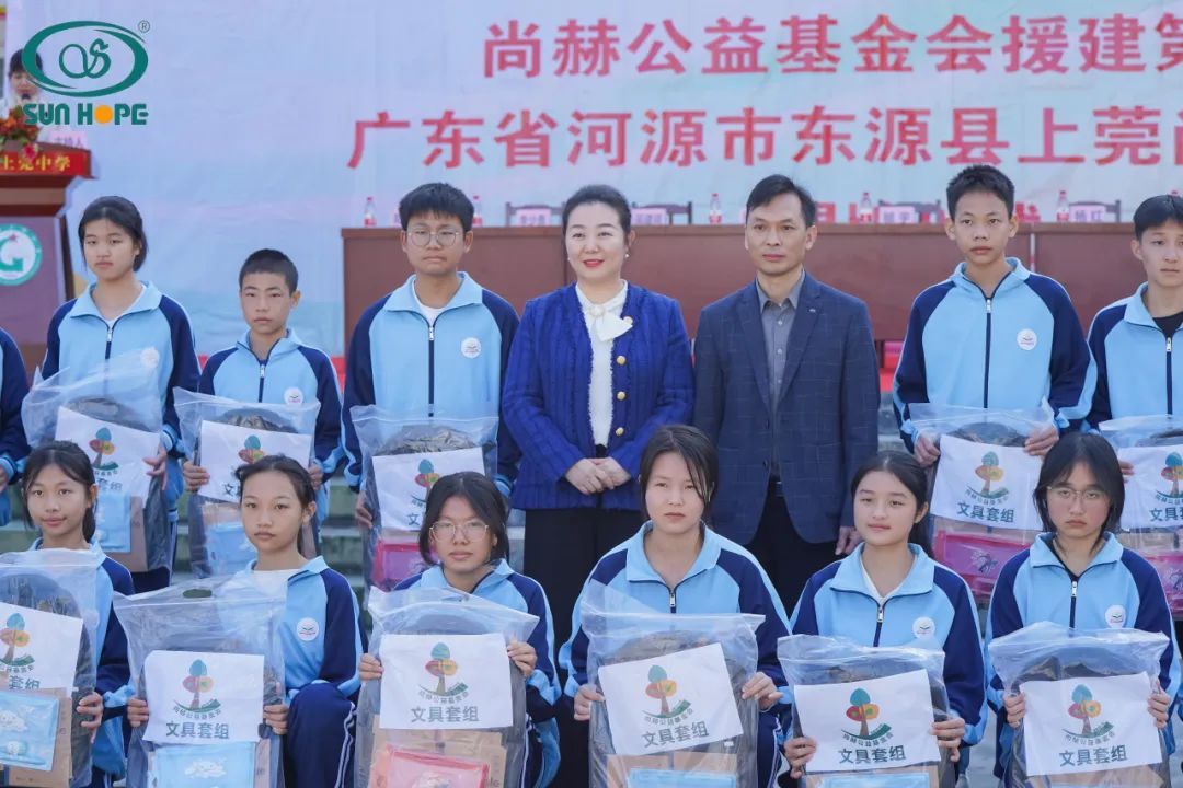 2023年11月21日,虽然已是寒冬时节,天气渐冷,但广东省河源市东源县上莞中学却一股股暖流直达人心。当天上午,广东省河源市东源县教育局副局长张志谦,东源县上莞镇党委副书记吴建润,东源县上莞中学校长李少勇,尚赫爱心大使郇宇以及爱心志愿者们为第243所尚赫公益学校揭牌,并为上莞中学学生们送来了捐助善款,精美的书本、贴心的礼物,助力他们健康成长。这也是尚赫公益基金会在广东省援建的第9所学校。尚赫爱心大使们用他们满满的爱心,让涓涓细流汇成江海。