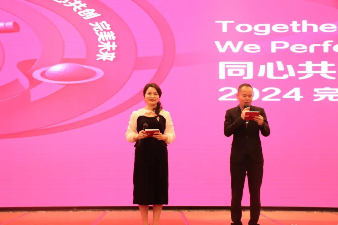 一曲《启程》将会议氛围推上了高潮,大家携手登上舞台,完美公司三十年,启航2024,金甲征程,不胜不还。