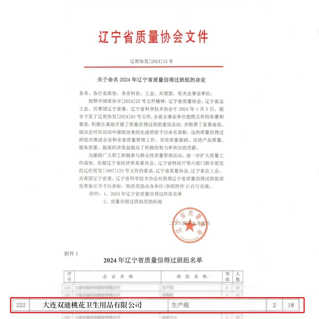 近日,辽宁省质量协会正式公布了2024年度辽宁省质量信得过班组评选结果,双迪桃花公司生产部凭借优秀的质量管理水平和显著的管理成果,荣获“辽宁省质量信得过班组”称号,这既是对公司员工集体付出的肯定,也是对企业生产管理体系的高度认可。